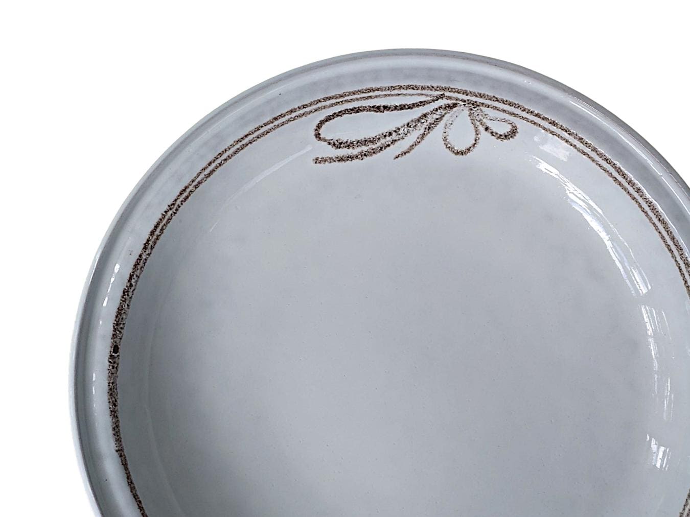 Die Glasur ist hell, fast weiß mit einem Hauch von Grau. Am Rand zieht sich ein feines braunes Band, das in einer Schleife endet – dezent und doch charaktervoll. In dieser Reduktion liegt ihre Stärke: nichts drängt sich auf, alles bleibt zurückhaltend. Es ist genau diese Zurückhaltung, die sie zeitlos wirken lässt. Sie fügt sich in moderne Wohnräume ebenso ein wie in nostalgische Interieurs.